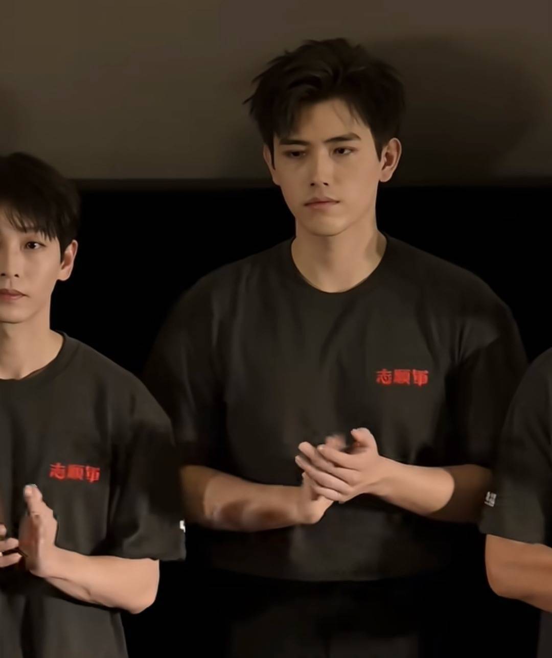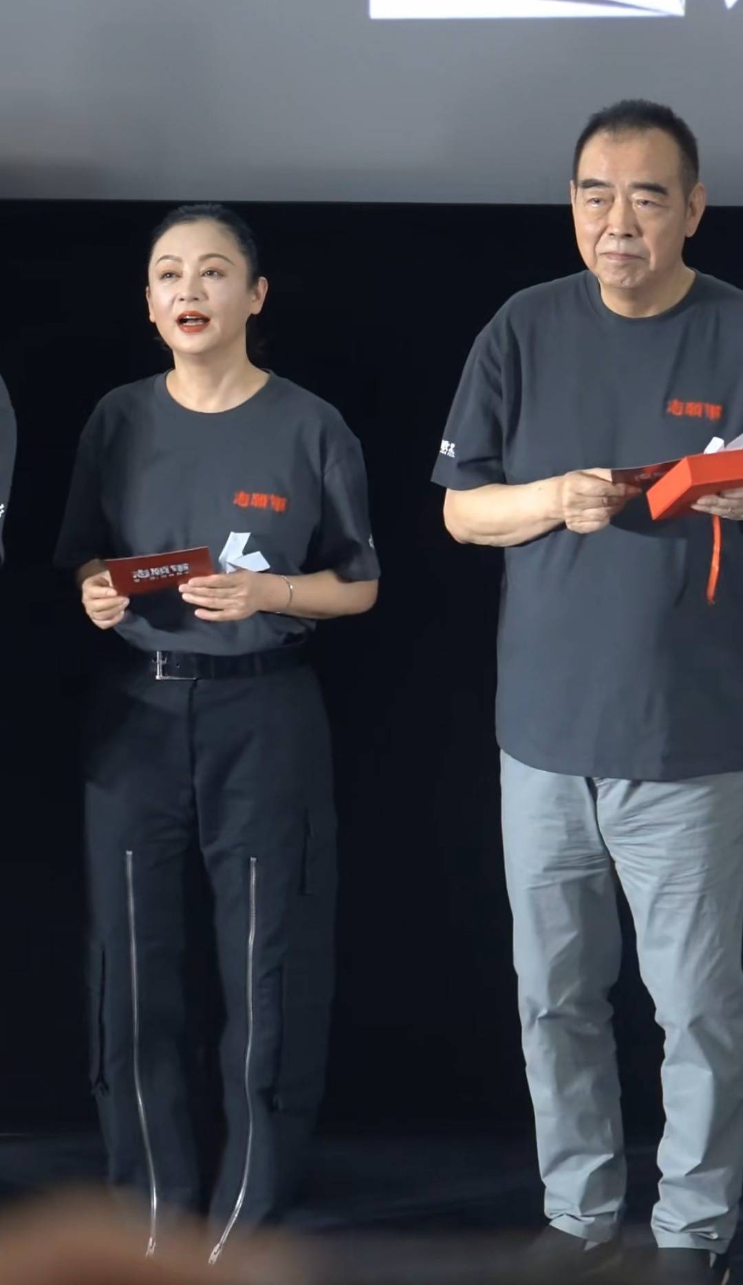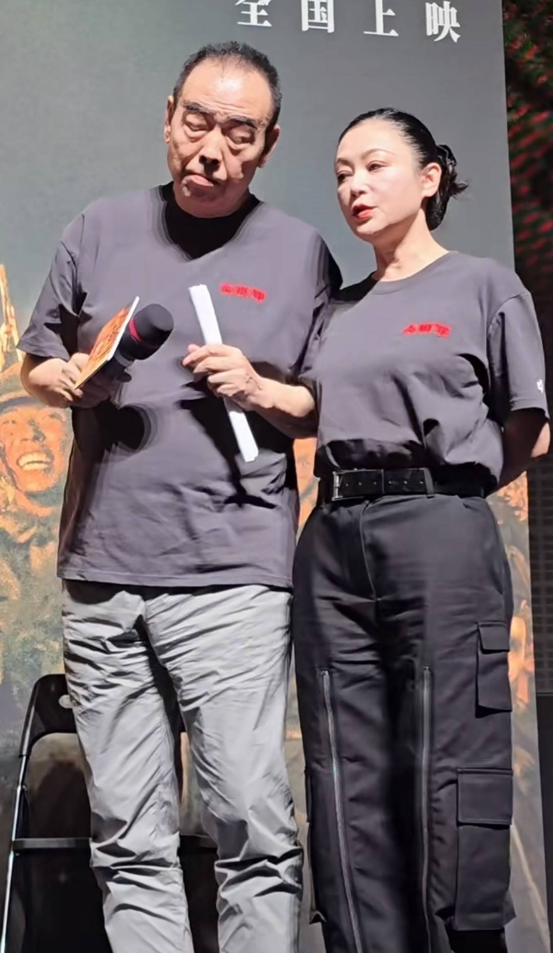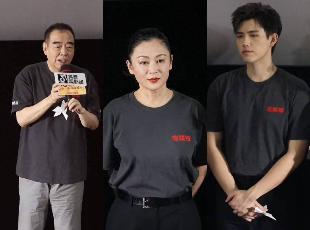当天,陈红和陈凯歌都穿着电影宣传T恤,夫妻俩并没有和儿子陈飞宇站一块。陈飞宇在另一边和其他几位演员一起,现场表情严肃,状态紧绷,看来爸妈都在场并没有让陈飞宇放松一些。